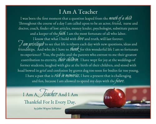 When I first read John Wayne "Jack" Schlatter's, "I Am A Teacher," it shifted my consciousness to a higher level. I unexpectedly felt it, down to my toes, that being a teacher was about something far greater than myself. In that moment, I instantly saw how we could create an "I Am A Teacher" poster so that every teacher could have this to be encouraged by daily. So we've created a special webpage for schools and anyone affiliated with a school (PTA Leaders) to purchase our heartfelt inspirational "I Am A Teacher" Posters for every teacher on your faculty.