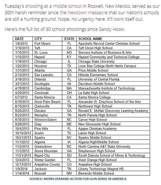 From the desk of ... Mary Robinson Reynolds, M.S. Educational Psychologist I am too. My biggest concern is that these school shootings are becoming white noise. Yesterday's shooting got only a few minutes on the news. Here is an excerpt ... The Sad List: There Have Been 30 School Shootings Since Newtown